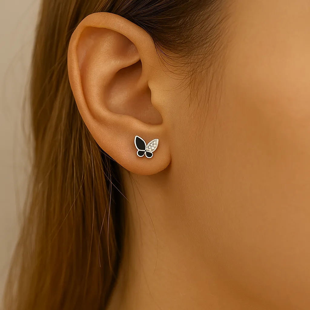 Изящни обеци с форма на пеперуда, които съчетават елегантност и артистичност. Инкрустирани с малки циркониеви камъни, те блестят нежно, като крилата са оцветени за по-изразителен и модерен ефект. Предлагат се в сребърен вариант или със златно покритие, за да отговарят на всеки стил. Леки, удобни и хипоалергенни, тези обеци са перфектен аксесоар за дами, които искат да впечатлят.