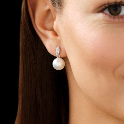 Деликатно извити елементи, инкрустирани с блестящи цирконии, преливат в нежно окачена перла – символ на женственост и елегантност. Изработени от висококачествено сребро 925, обеците предлагат комфорт и вечен стил.