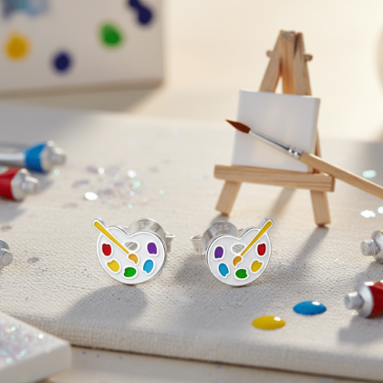 Развихрете въображението с тези цветни и оригинални сребърни обеци във формата на палитра и четка. Перфектен избор за малки творци и любители на рисуването, тези обеци са изработени от фино сребро проба 925 и декорирани с пъстри емайлирани капчици „боя“ – истинско вдъхновение в миниатюрен размер.