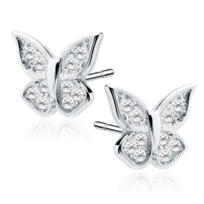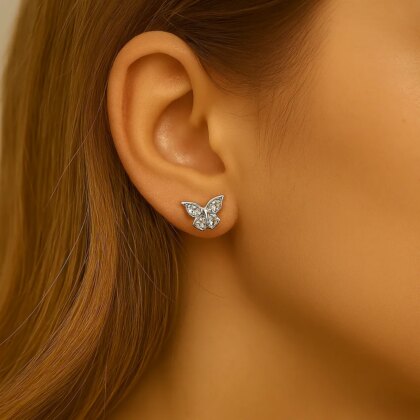 Нежни сребърни обеци с форма на пеперуда, украсени с блестящи камъчета от цирконий за изискан блясък. Символ на красота и свобода, тези обеци са изработени от висококачествено хипоалергенно сребро, което ги прави безопасни и удобни за ежедневно носене.