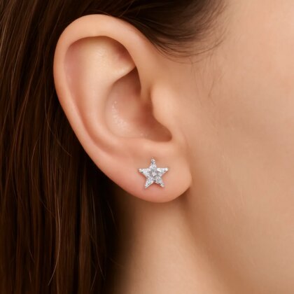 Блестящи сребърни обеци с форма на звезда, изработени с искрящи циркониеви камъни, които улавят светлината и придават изящен блясък. Леки и хипоалергенни, те са удобни за носене през целия ден. Символ на мечти и сияние, тези обеци са идеален аксесоар за малки и големи дами, добавяйки елегантност и магия към всяка визия.