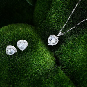 Комплектът от сребро включва елегантно колие и чифт обеци. Всеки елемент е украсен с красиво оформени сърцевидни камъни, обградени от фини малки цирконий, които добавят изключителен блясък и стил. Идеален подарък за специален човек или перфектно допълнение към личната ви колекция от бижута.