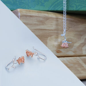 Елегантният комплект включва сребърни обеци и колие, изработени от висококачествено сребро проба 925. Фините детайли в дизайна на всяка част са вдъхновени от красотата и нежността на розата, символ на любов и елегантност.