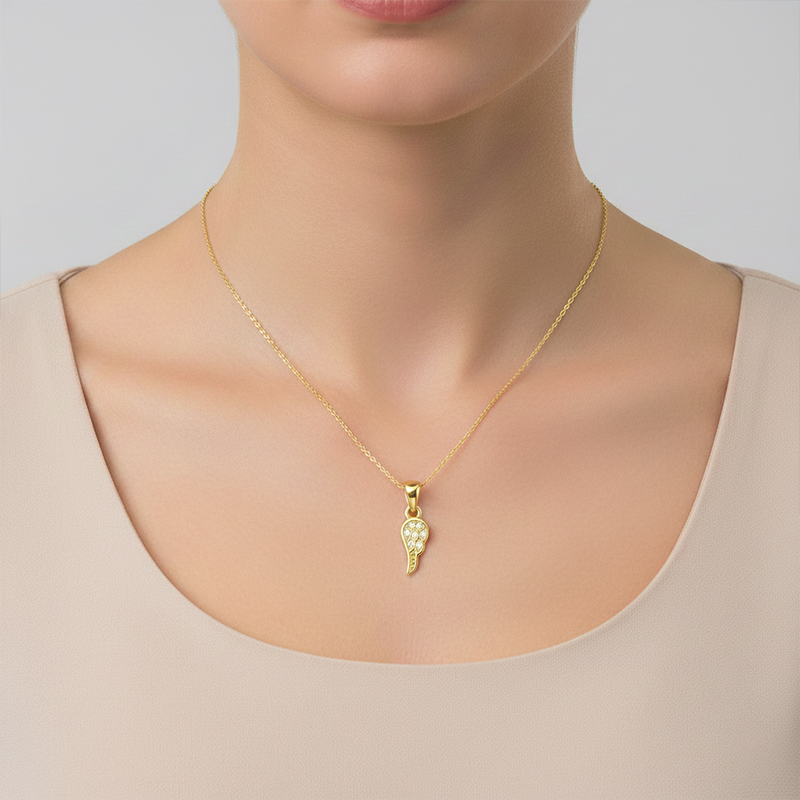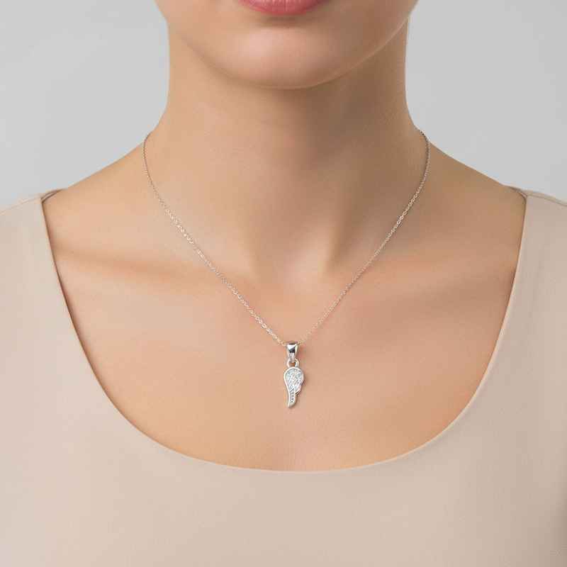 Понеси се в света на светлината и нежността с тази изящна сребърна висулка във форма на ангелско крило. Изработена от висококачествено сребро проба 925 и украсена с бляскави циркониеви камъни, тя символизира закрила, вяра и вътрешна сила. Перфектен подарък за любими хора или като личен талисман, който да напомня, че винаги има светлина около нас. Съчетава се елегантно с фина верижка и подхожда както за ежедневна визия, така и за специални поводи. Предлага се и в позлата.