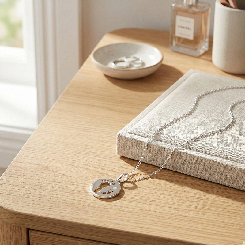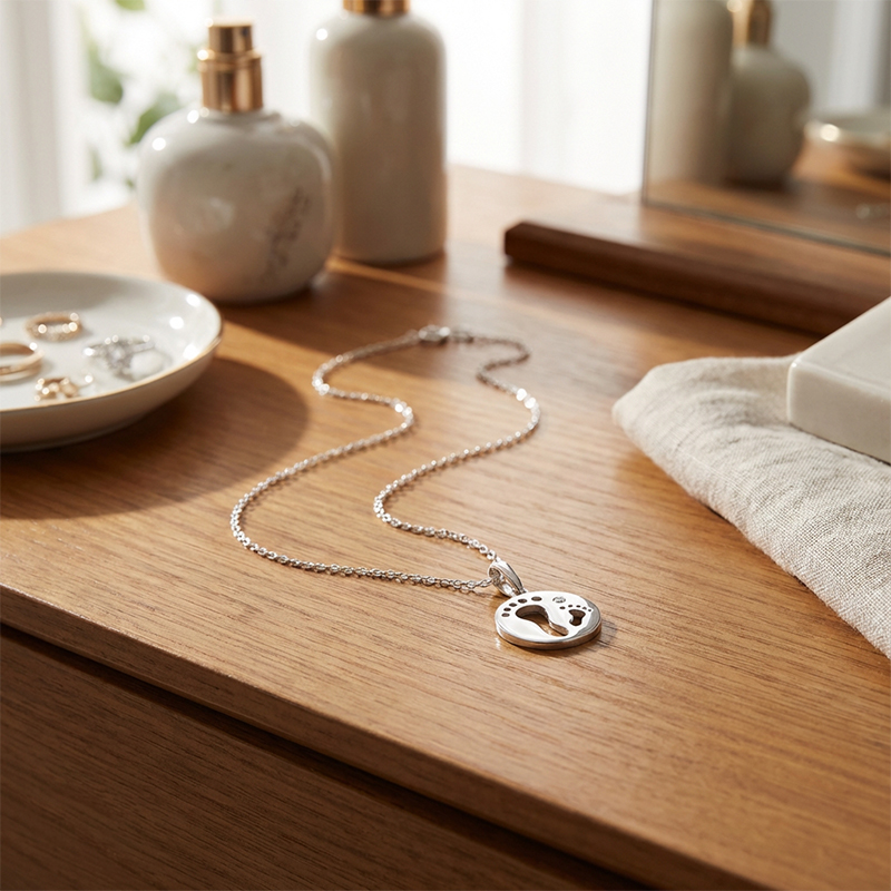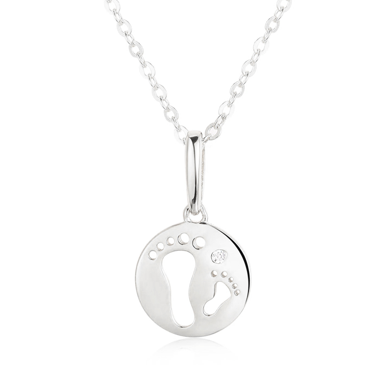 Нежно и сантиментално сребърно колие със символичен медальон – изобразяващ отпечатъци от бебешки стъпки и искрящ камък цирконий. Дизайнът носи послание за ново начало, първи стъпки в живота и дълбока обич.