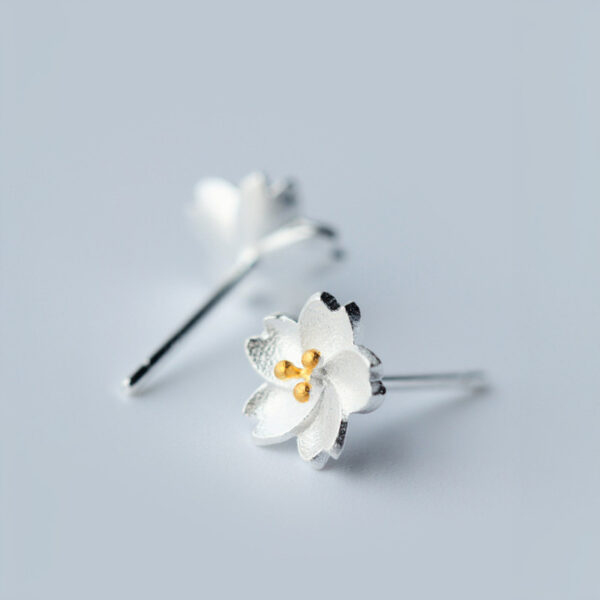 Минималистични сребърни обеци на нежни цветя с фини златни тичинки. Подчертайте своята естествена красота и изтънченост с този стилен аксесоар.