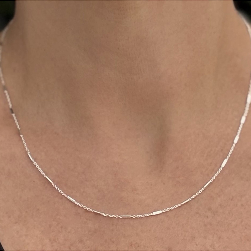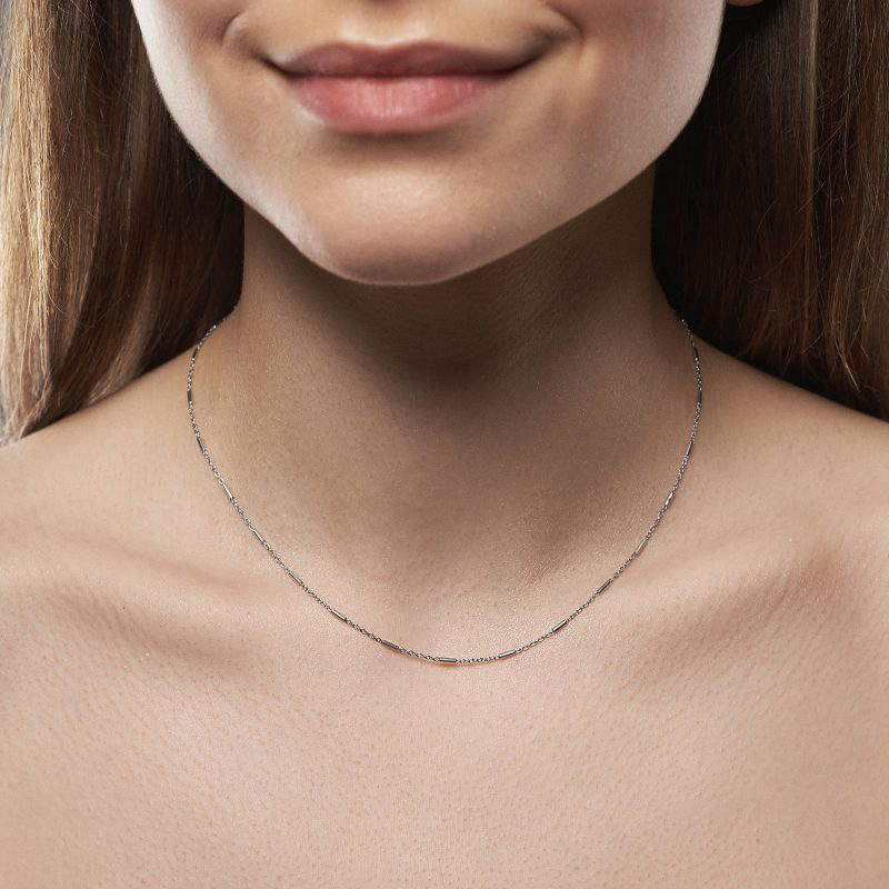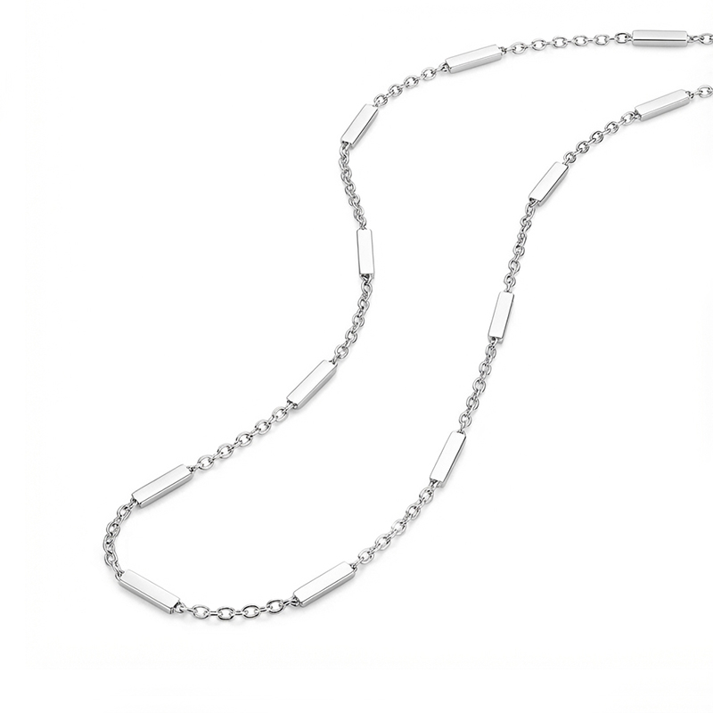 Семпъл, но стилен, този сребърен синджир е изработен от висококачествено сребро проба 925 и е подходящ както за носене самостоятелно, така и в комбинация с любим медальон. Фината му структура е допълнена с изчистени правоъгълни елементи и завършва с практичен удължител, който позволява прецизно регулиране на дължината.