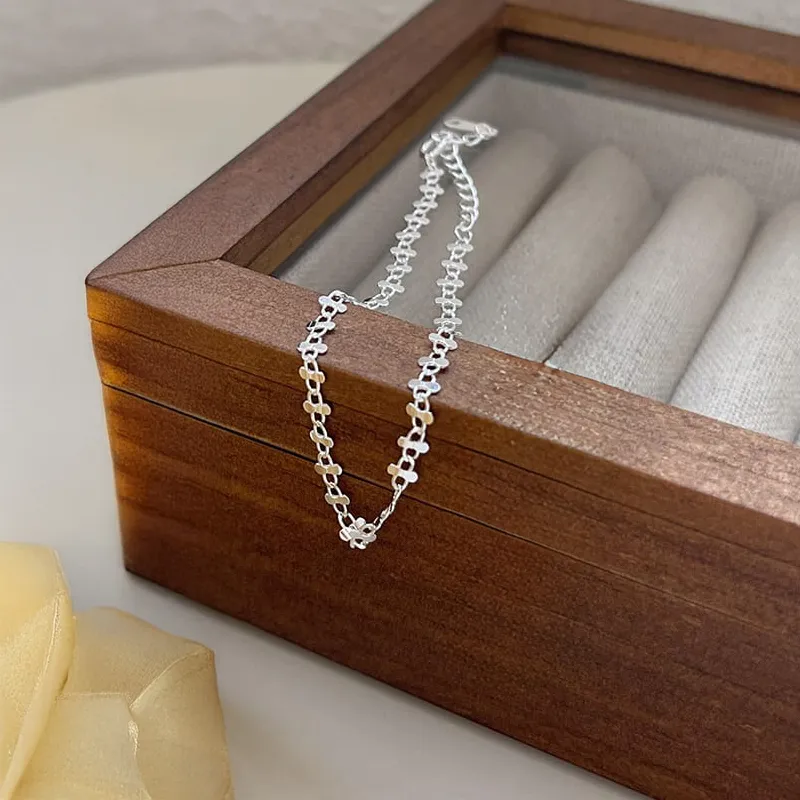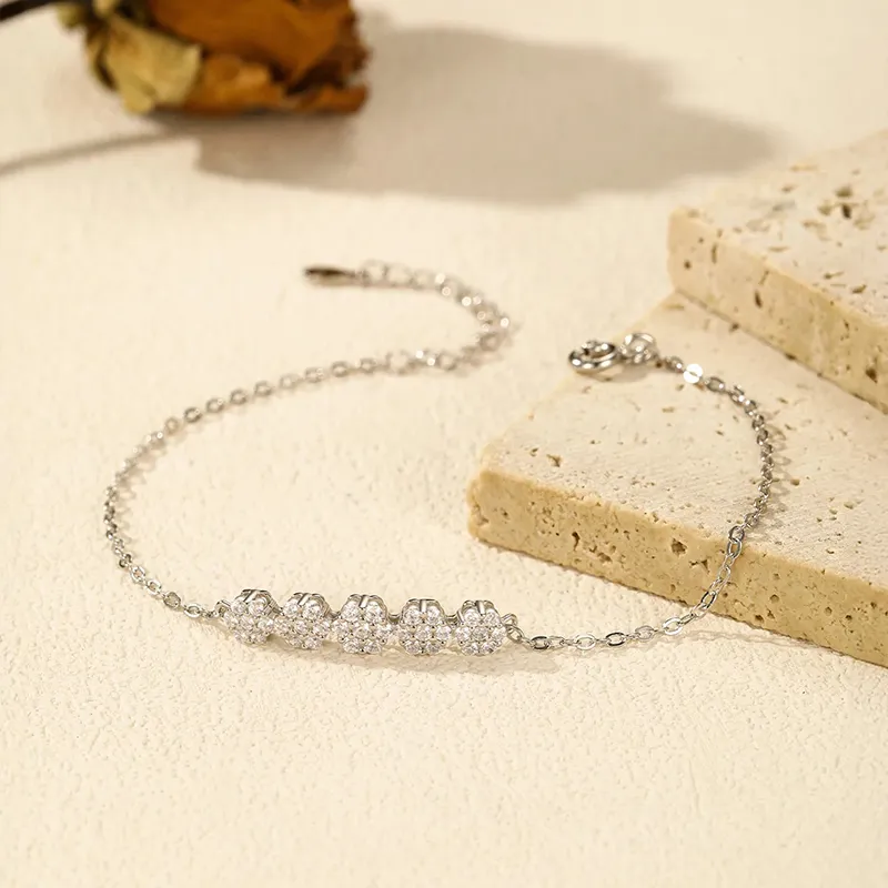 Тази изящна гривна от сребро 925 впечатлява с фината си верижка и уникалния дизайн от шестоъгълни елементи, обсипани с бляскави циркони. Съчетава модерна геометрия с класическа елегантност, подходяща както за ежедневието, така и за специални поводи. Регулируемата закопчалка осигурява удобство и перфектно прилягане.