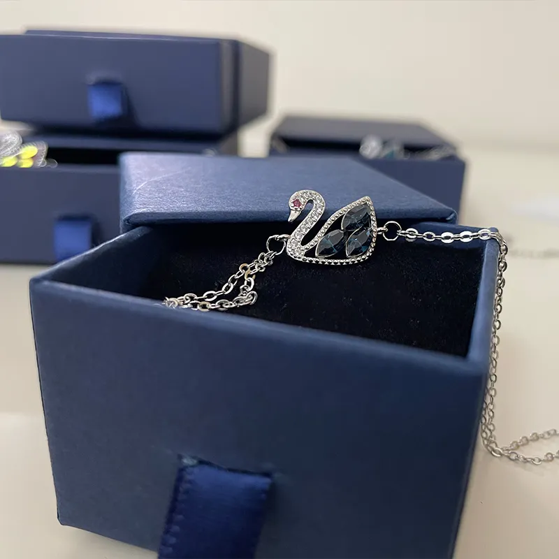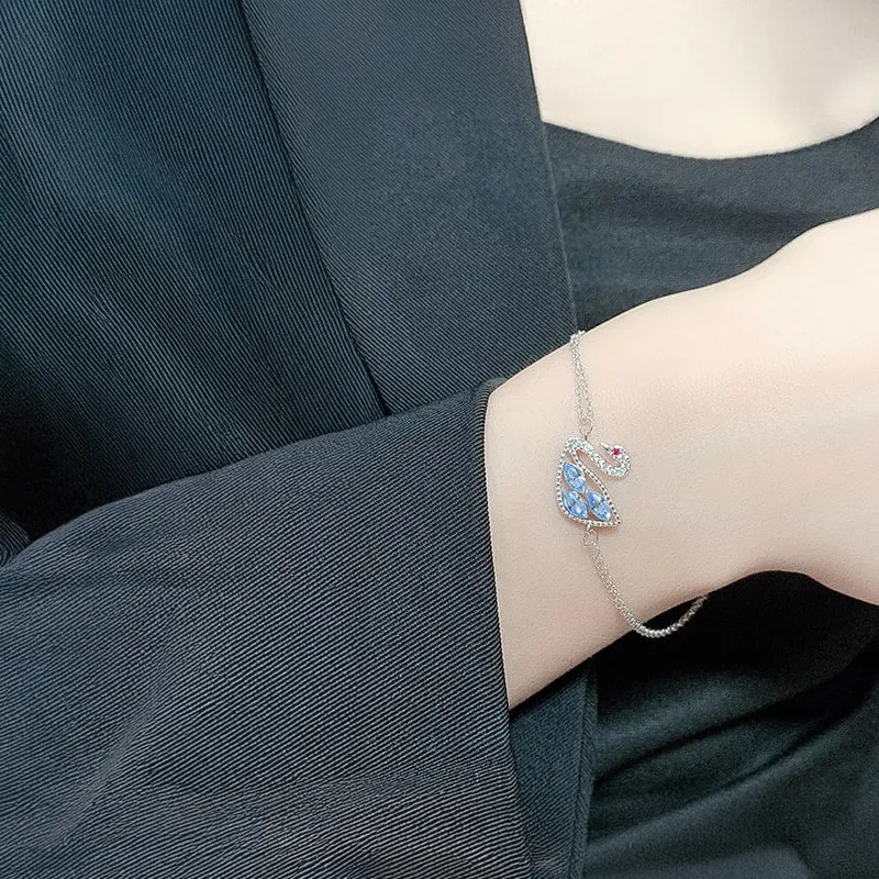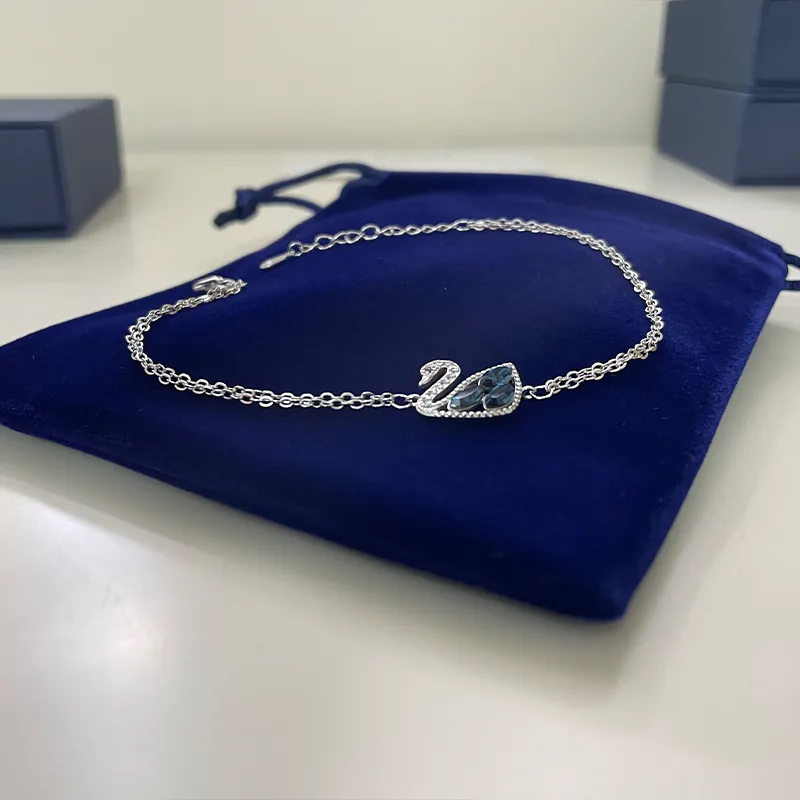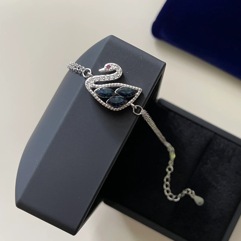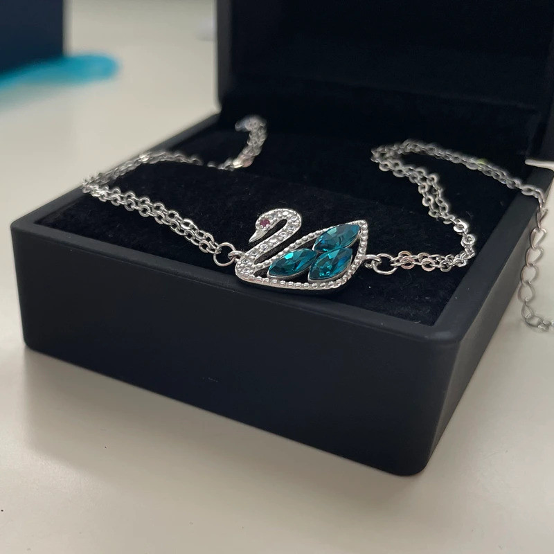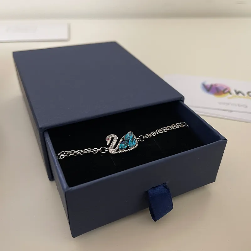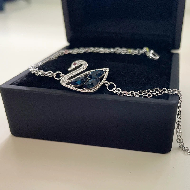 Комбинацията от грация, красота и съвършенство е най-отличителната черта на лебедa. Тези качества на благородната птица намират израз и в блестяща сребърна гривна с кристали Swarovski. Бижуто се състои от две верижки в класическа плетка, към които е захванат сребърен лебед. Изяществото му се допълва от кристали Swarovski, като може да избереш от деним, морско синьо или такива, които отразяват светлината. Гривната се поставя чрез закопчаване и е допълнена с удължител. Подходяща е за подарък на жена, любима, дъщеря, майка и изразява най-топли чувства.