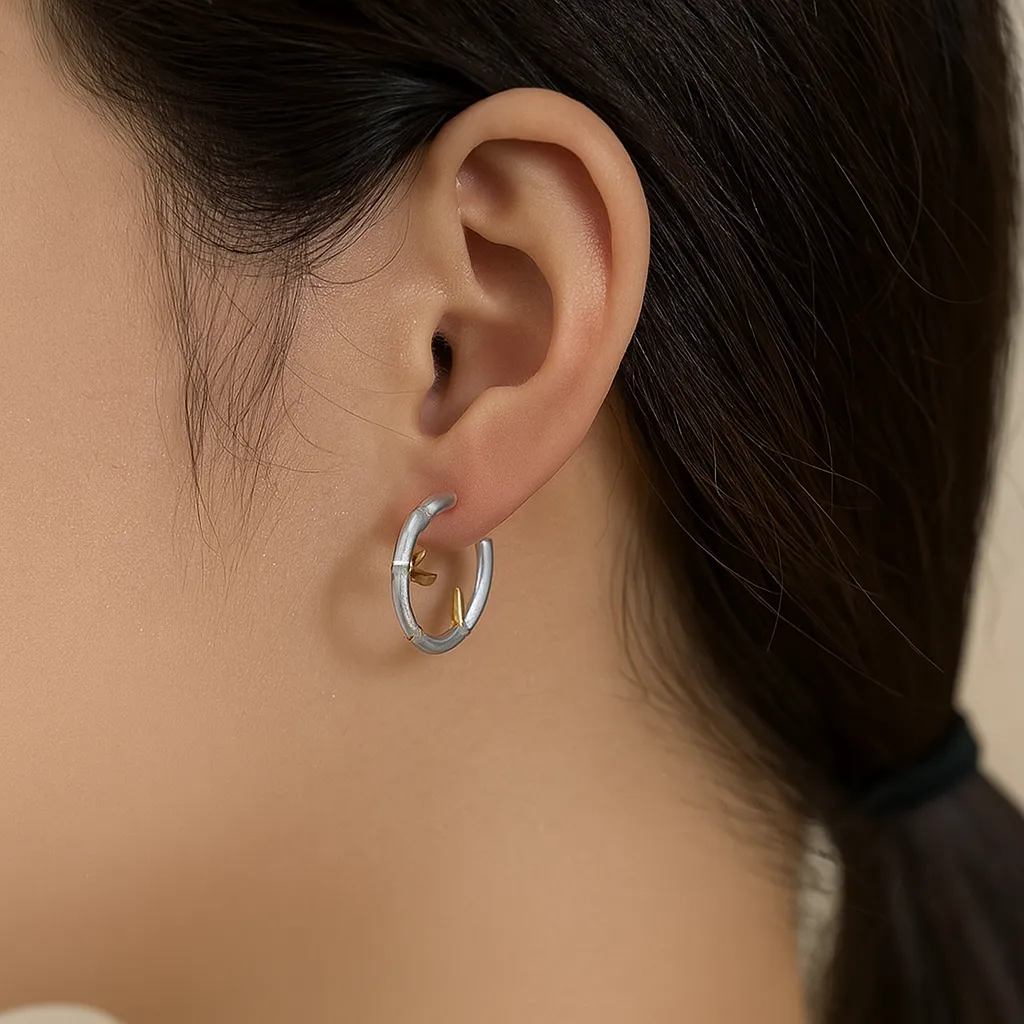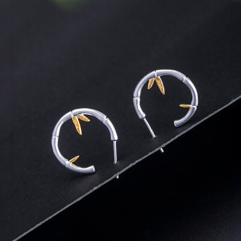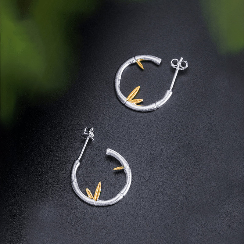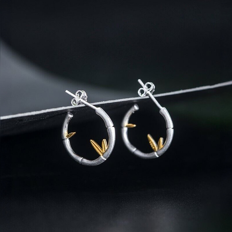 Сребърни обеци на винт, които наподобяват бамбук и са деликатно декорирани със златисти елементи. Могат да бъдат самостоятелен акцент във визията или да се съчетаят със същия модел сребърно колие.