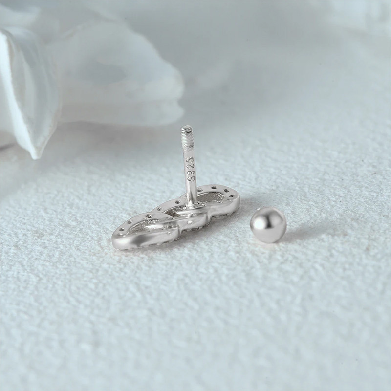 Минималистични сребърни обеци, които изобразяват три свързани елемента, покрити с блестящи цирконий. Стоят нежно по ухото и придават деликатно сияние.