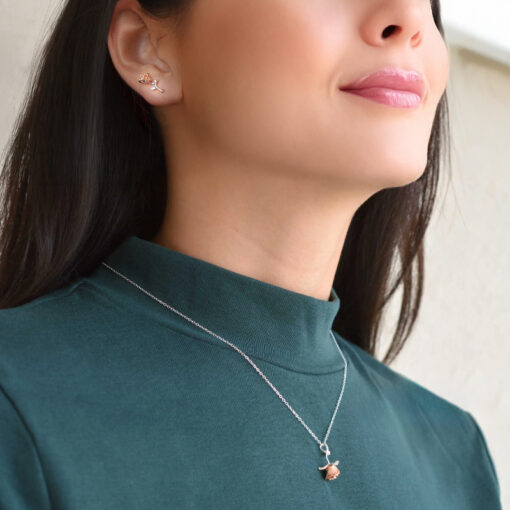 Елегантният комплект включва сребърни обеци и колие, изработени от висококачествено сребро проба 925. Фините детайли в дизайна на всяка част са вдъхновени от красотата и нежността на розата, символ на любов и елегантност.