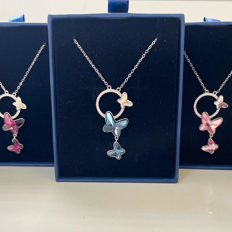 Пеперудата е символ на трансформацията и пример за създаваща се красота. Това послание носи и сребърното бижу с вградена кръгла висулка и три пеперуди. Две от насекомите са изработени от сребърна основа, запълнена с цветен кристал Swarovski, а третото е изцяло от сребро. Подареното колие носи пожелание за волност и неспирен полет към мечтите, които с малко търпение, се превръщат в реалност.