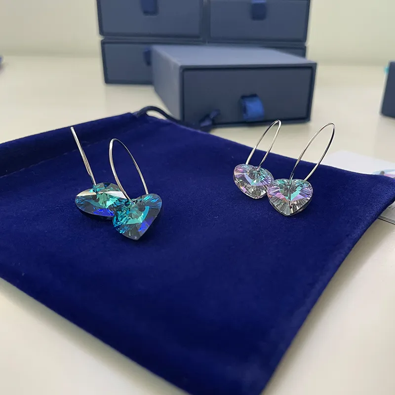 Носи любовта винаги със себе си с тези бляскави сребърни обеци с кристали Swarovski. Моделът е тип халка, към която има голям кристал Swarovski във форма на правилно сърце, символизиращ съвършената любов. Придай ѝ син или лилав нюанс и избери дали да съчетаеш обеците с подобни бижута или да носиш самостоятелно.