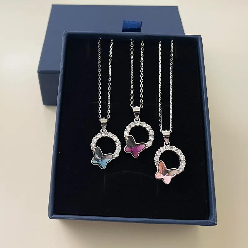 Нежно колие от сребро и кристал Swarovski от класическа ситна плетка. Към нея има вградена висулка в кръгла форма, обсипана с камъни и красива пеперуда в цвят деним, розово или виолетово, която неуморно ще пърха около врата ти. Така те пренася във вълшебния си свят и с игрив дизайн подсилва женствената визия.