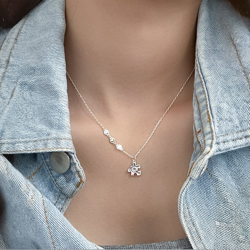 Игриво и уникално бижу, което добавя радост и чар към всяка визия. Основният акцент на колието е сребърна висулка във формата на пъзел, украсена със симпатично усмихнато лице. Допълнителен елемент са трите малки усмивки, които са дискретно вградени във верижката, символизиращи щастие и позитивност. Това колие е идеалният аксесоар за хора, които обичат да носят нещо различно и оригинално. Подходящо както за ежедневието, така и за специални поводи, Ще ви напомня винаги да намирате радостта в малките неща и да разпръсквате усмивки около вас.