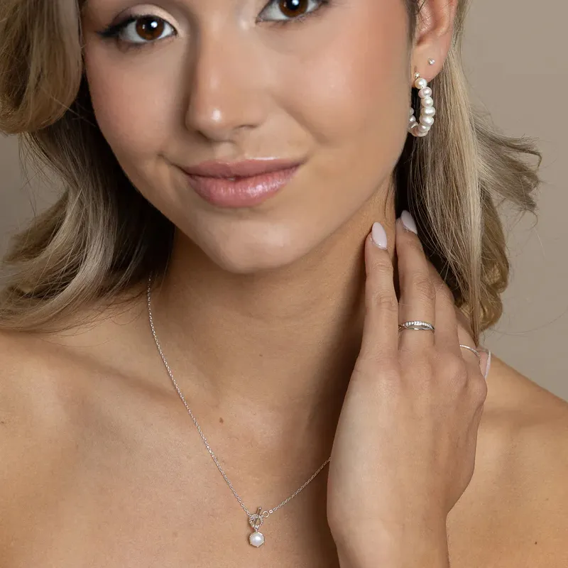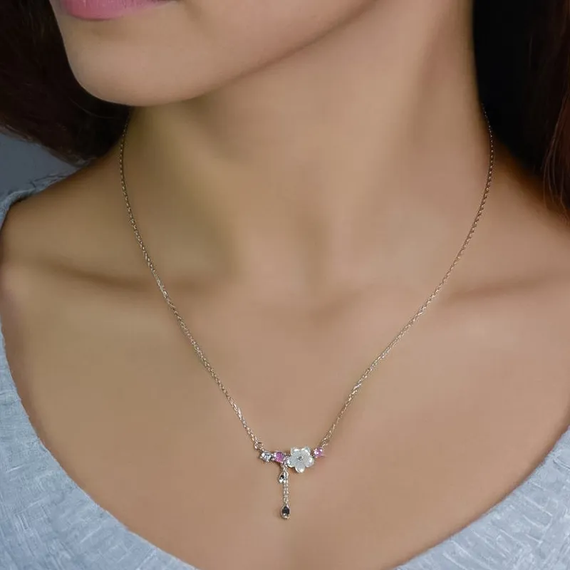 Изящно сребърно колие, вдъхновено от красотата на разцъфналите цветя. Комбинацията от нежна бяла перлена цветна фигура и розови акценти създава романтично излъчване, а висящите сърчица добавят нотка игривост. Перфектен подарък за дама, която цени финеса и женствеността.