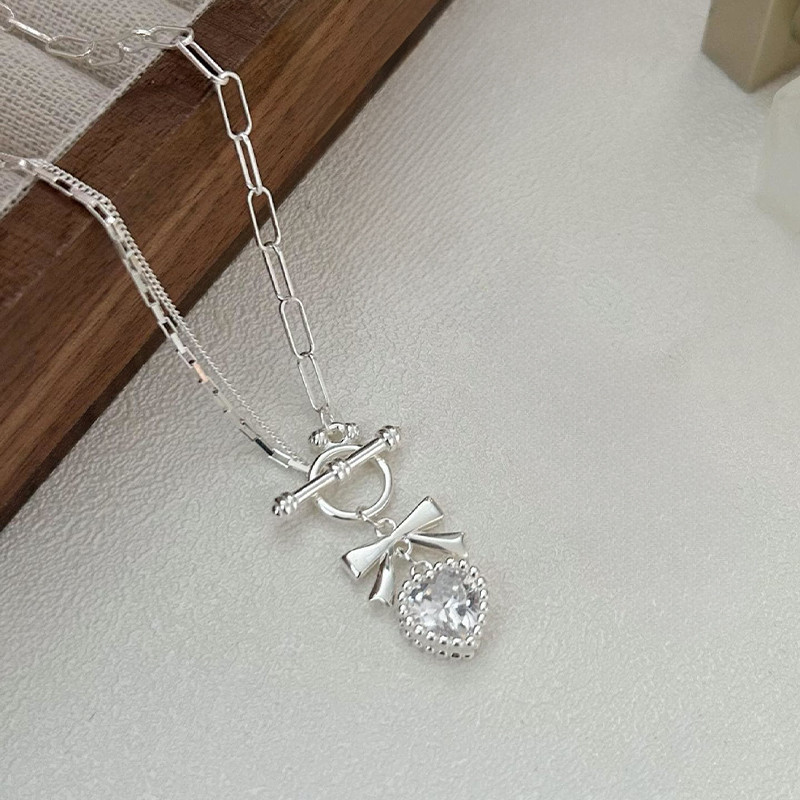 Главният акцент на колието е изящен висулка във формата на сърце, обсипана с блестящи циркониеви камъчета, която нежно се спуска под елегантна панделка. Верижката е с уникален дизайн. Закопчаването на колието също впечатлява със своя стил и функционалност, което придава завършеност на този луксозен аксесоар. Идеалният избор за специални поводи или като израз на вашата любов и привързаност към някого. Това колие е не просто бижу, а символ на елегантност и романтика, който ще добави неповторим блясък към всяка визия.