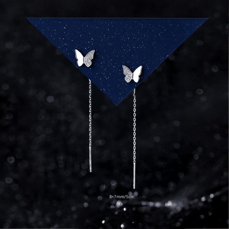 Очарование, модернизъм и блясък са събрани във висящите обеци от сребро 925. Те се поставят на ухото чрез промушване. Акцентът им е в нежната сребърна пеперуда, обсипана със сияйни цирконий. Истинско усещане за пърхаща красота ще изпита всяка жена или момиче, получило обеците като персонален подарък за личен празник.