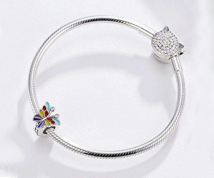 Елегантен стопер, изработен от сребро и покрит с малки бели камъни цирконий. Нежното бижу не само придава стил към визията, но има и уплътнител от силикон, който предпазва останалите талисмани от изхлузване. Към стопера има сребърен елемент под формата на пеперуда, чиито криле са от емайл в различни цветове. Тя символизира красотата от настъпващата промяна и усещането за полет на душата. Незабравим подарък за специален човек.