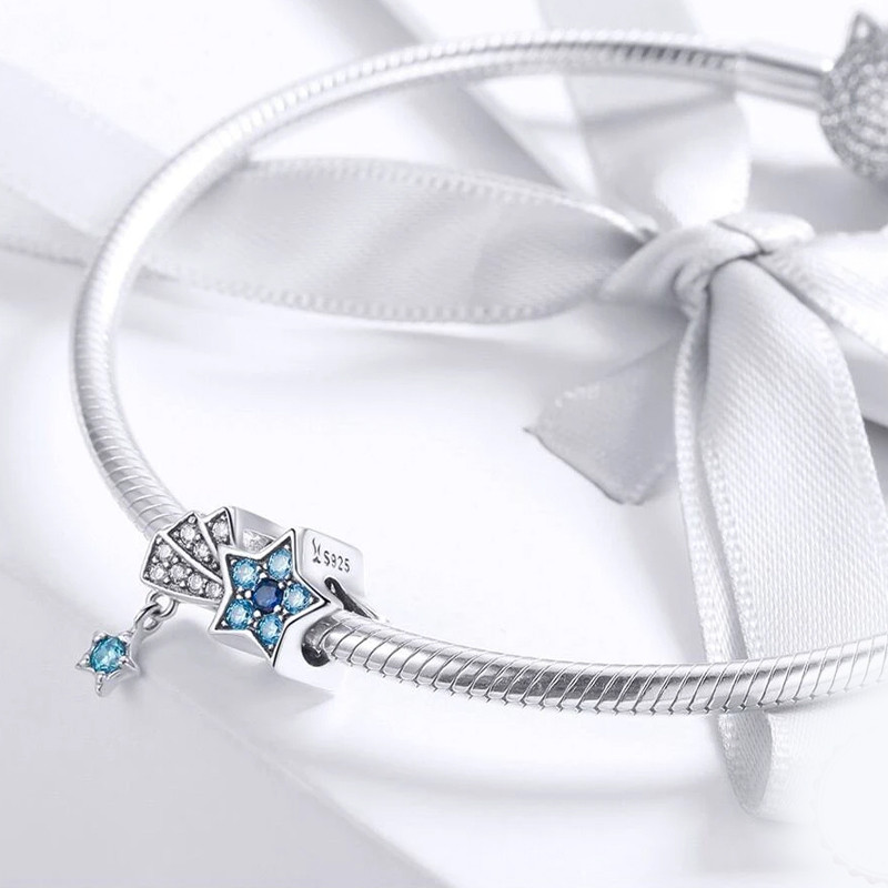 Сребърен талисман с форма на звезда, изработен от сребро с проба 925. Комбинацията от блестящи прозрачни и сини цирконий придава ослепително сияние, което наподобява небето в ясна нощ. Нежен и изискан, може да се носи като елегантно допълнение към гривна или колие.