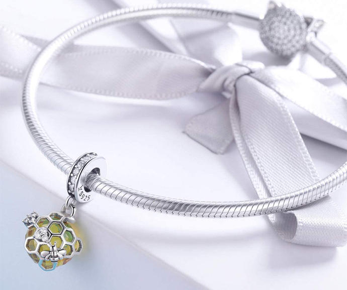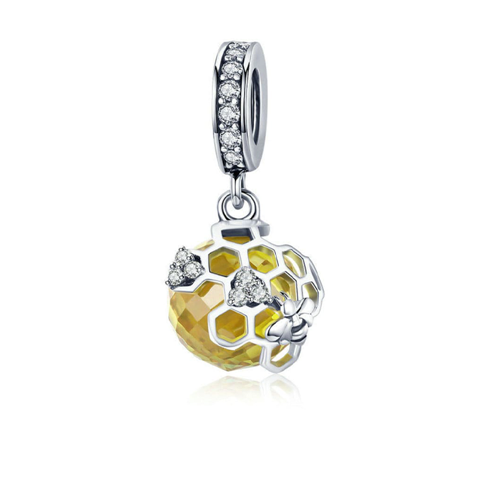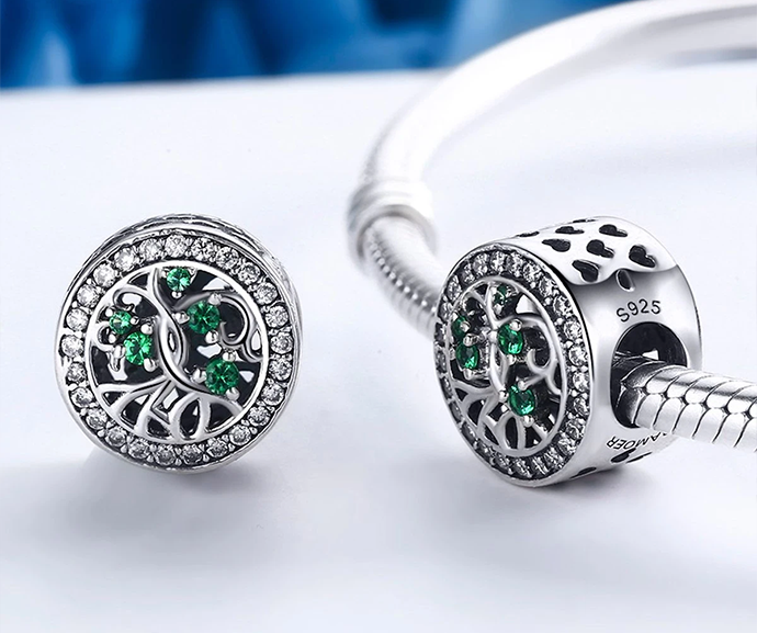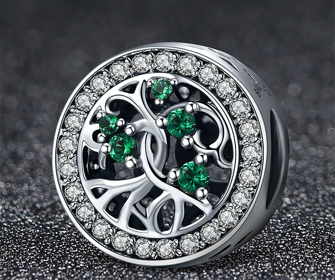 Талисман от сребро в кръгла форма. Рамкиран е с бели циркониеви камъни, а в средата му е изобразено дърво със зелени цирконий и малки кръгли топчета от благородния метал. Страните на бижуто са покрити със сърцевидни форми. Изключително стилно и нежно допълнение към сребърна гривна или колие. Подходящо за специален повод или като акцент към ежедневния стил. Мил жест за личен празник, за жена, за майка или за любима.