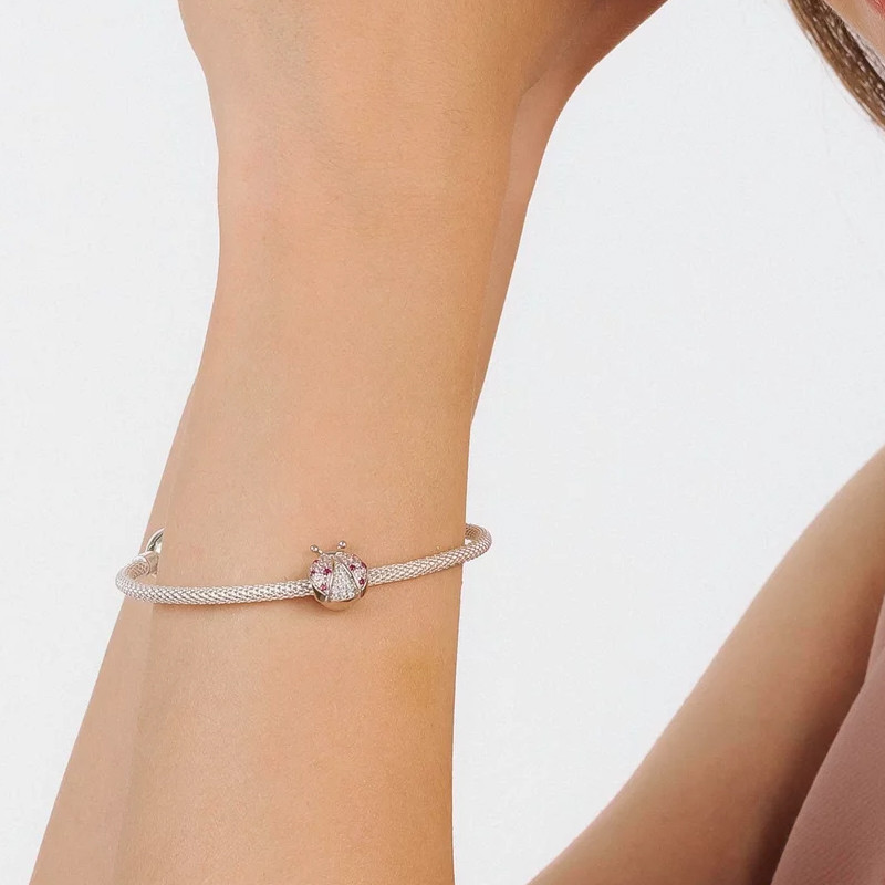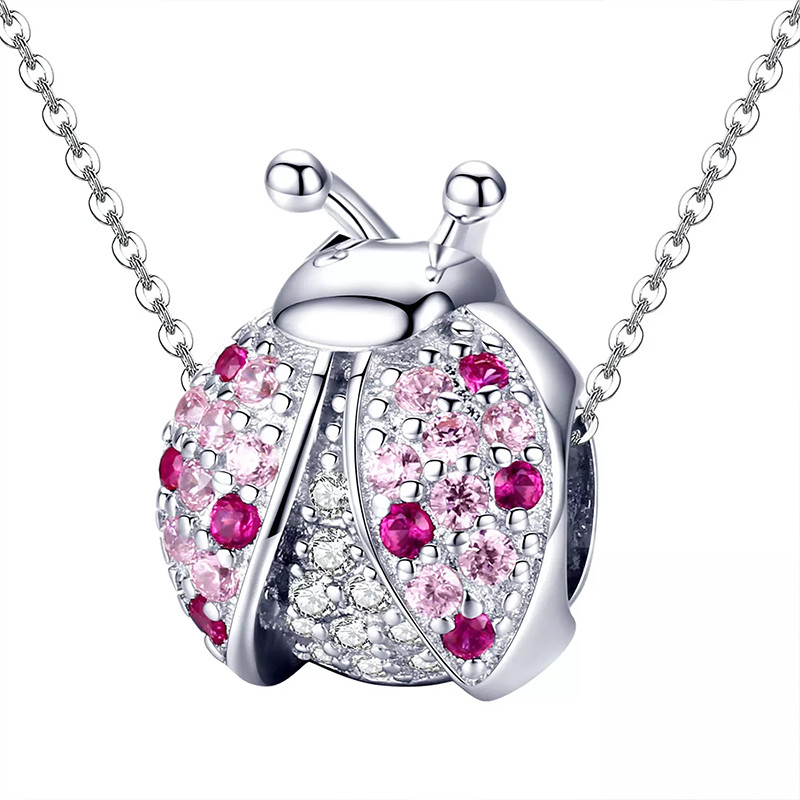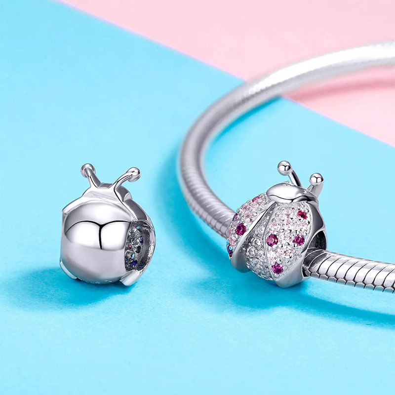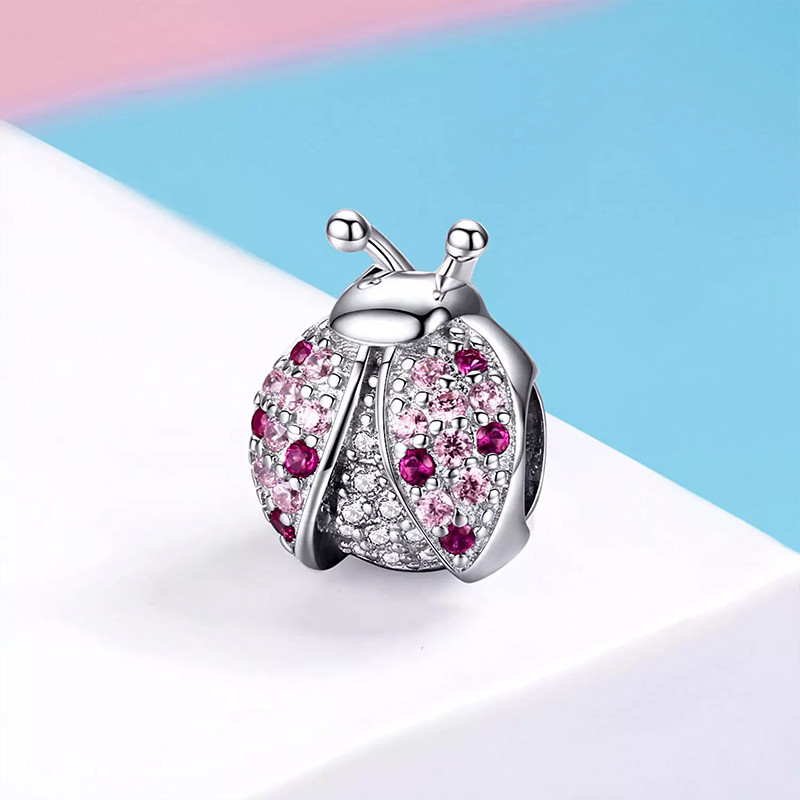 Моден и стилен сребърен талисман, изработен във вид на калинка. Бижуто е изключително красиво и нежно, а в допълнение с розови и бели камъни цирконий, създава истинска приказна визия. Подходящо е и за гривна и за колие. Персонален подарък, който може да се носи през всеки делник и празник и предвещава късмет, благополучие и любов.