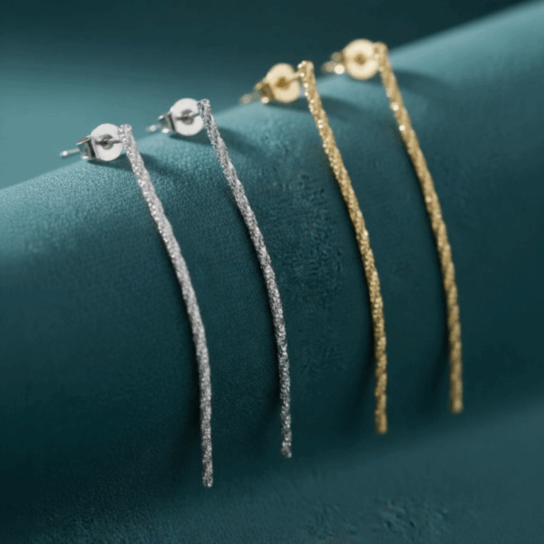 Прецизно изработени сребърни обеци с внимание към детайлите за истински шик. Именно това описва дизайнът на бижутата с проба 925, които се захващат за ухото чрез винт и са налични в бял и жълт цвят. Те са съставени от няколко верижки вплетени една в друга и носят усещането за класа, женственост и елегантност. Сребърните бижута могат да бъдат подарени за абитуриентски бал, рожден ден, Коледа и Нова година или друг повод.